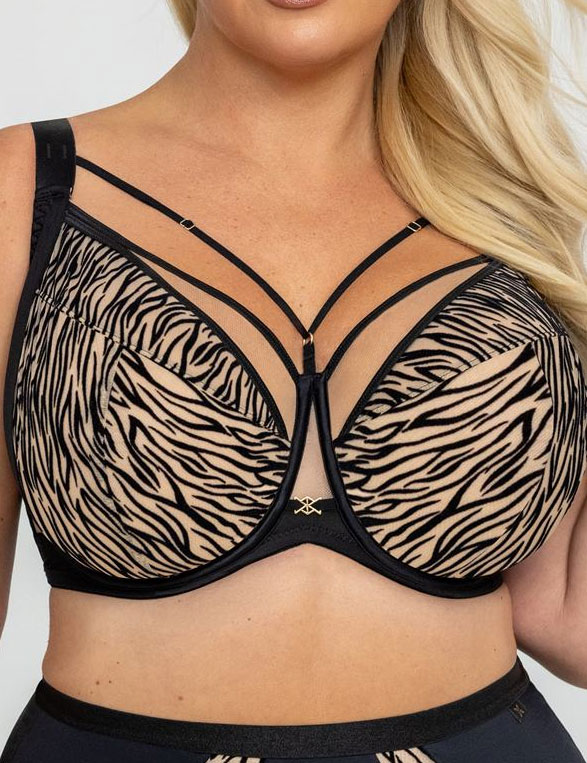 Роскошный бюстгальтер из коллекции Queen польского бренда Kris Line создан для большой груди и того самого ощущения уверенности, когда поддержка чувствуется сразу — и телом, и взглядом. Черное однотонное полотно служит спокойным фоном для выразительного анимал-принта: бархатистые флоковые полосы добавляют глубину, объем и тонкую игру фактур, делая модель визуально насыщенной, но не перегруженной. Мягкие чаши с боковым подкроем аккуратно собирают грудь к центру, формируя красивую округлую линию и придавая силуэту собранность. Поддержка ощущается надежной, но деликатной — без жесткости и излишнего давления. Стреп-бретели работают не только на посадку, но и на образ: они добавляют характер и превращают бюстгальтер в заметную деталь, которую хочется показать под жакетом или полупрозрачной блузой. Модель, в которой комфорт и выразительность идут рядом — спокойно, уверенно, по-королевски.